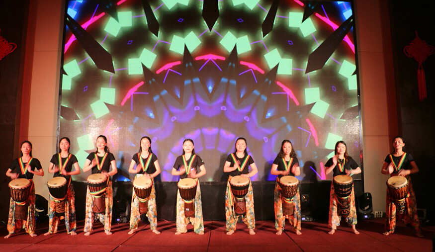 随着一阵激越的鼓声响起,全场的目光都投向了舞台。公司特邀表演团队凤凰花音乐工坊的一群靓丽少女,手起手落,灵巧有力地拍打着非洲鼓,神采飞扬。再配以优美的歌声舞姿,尽显异域风情。鼓声时而激越急促,时而浑厚悠宛,声动全场,直击人心,瞬间引爆现场氛围,拉开了迎新年会的大幕。